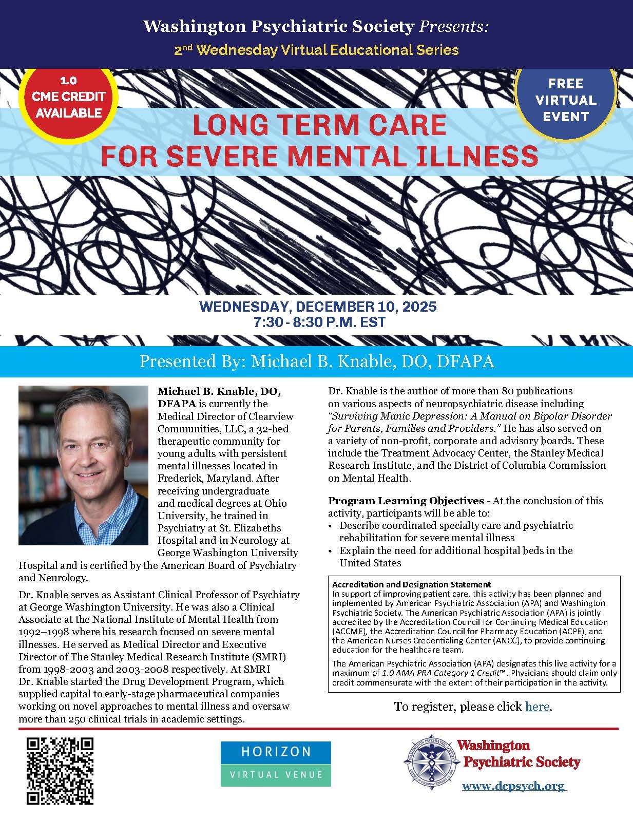 In support of improving patient care, this activity has been planned and implemented by American Psychiatric Association (APA) and Washington Psychiatric Society. The American Psychiatric Association (APA) is jointly accredited by the Accreditation Council for Continuing Medical Education (ACCME), the Accreditation Council for Pharmacy Education (ACPE), and the American Nurses Credentialing Center (ANCC), to provide continuing education for the healthcare team.